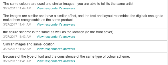 This question was hugely successful in trying to fully understand if audience had identified the overall brand identity and if they felt all the products conformed to it. The fact that all three products did is my evidence for suggesting that the need for the artist themselves to feature is unnecessary if you can create a brand identity without it.